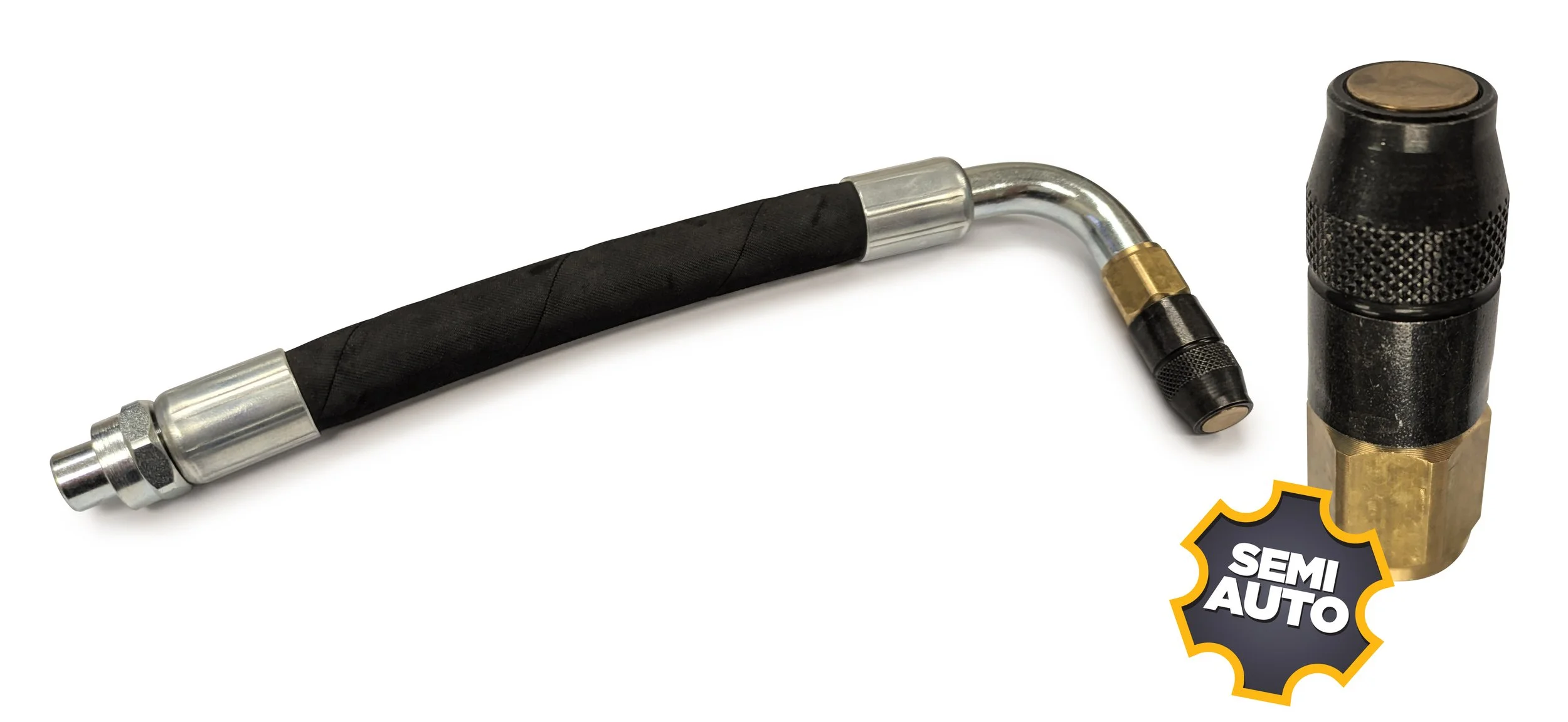 The semi automatic tip opens automatically when the trigger is pulled, but the operator needs to push the tip back in after use to stop it dripping. This tip needs to be placed in a drip tray holder and is not recommended for free hanging set ups.